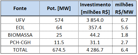 Os Investimentos estimados são da ordem de 4.3 bilhões, distribuído pelas fontes conforme a tabela.